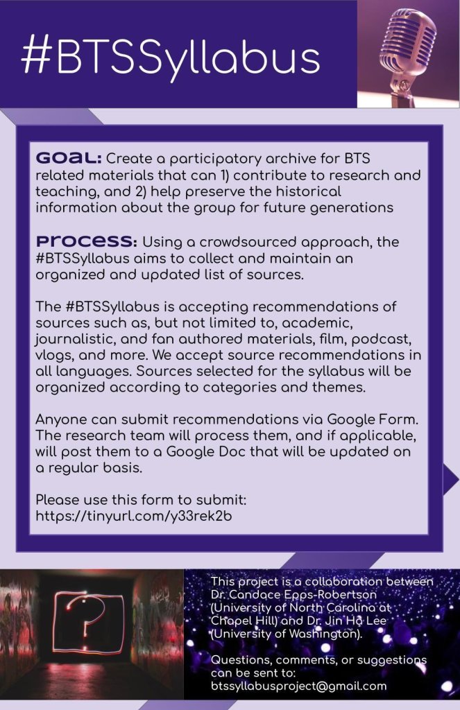 The #BTSSyllabus Project is an in-progress, collaborative project aiming to make research, teaching, and writing about BTS more accessible. Using a crowdsourcing approach, we strive to catalog content from various genres (academic articles, film, vlogs, blogs, journalistic, archival) and authors/creators. Based on collective contributions, this project is run by Dr. Candace Epps-Robertson, Dr. Jinha Lee, and Cassie Nguyen.